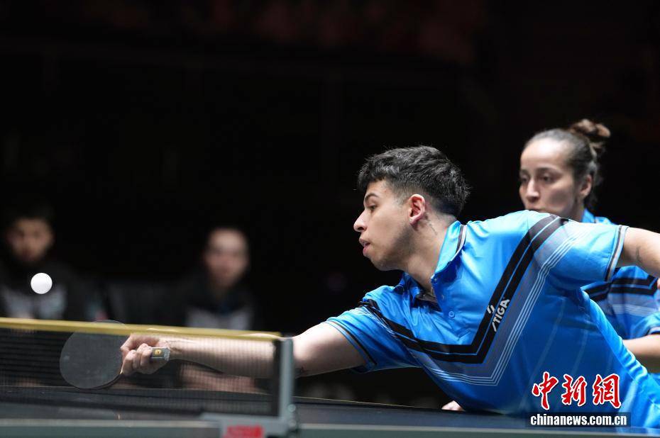 12月2日,四川成都,智利队队员尼古拉斯·博格斯(前)与波琳娜·维加在混合双打比赛中。当日,2025年成都国际乒联混合团体世界杯第一阶段比赛中,中国队以8:0战胜智利队。中新社记者 安源 摄