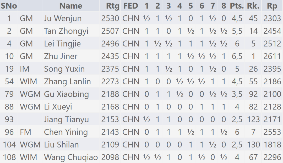 朱锦尔以6.5分,继续位列榜首。雷挺婕和陈一宁同积6分,谭中怡积5.5分,宋宇新积5分,居文君、张岚琳同积4.5分。王楚乔和李雪怡同积4分,谷笑冰积3.5分,刘适兰和姜天瑜同积2.5分。