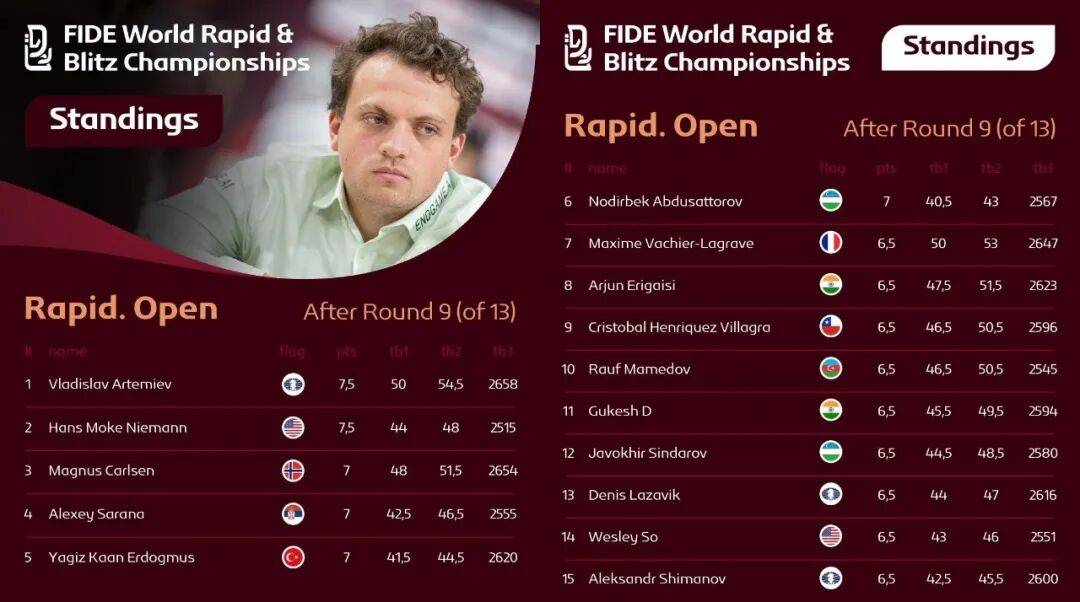 与卡尔森同积7分的还有塞尔维亚的萨拉纳、土耳其神童艾尔多莫斯和乌兹别克斯坦的阿卜杜萨托洛夫。