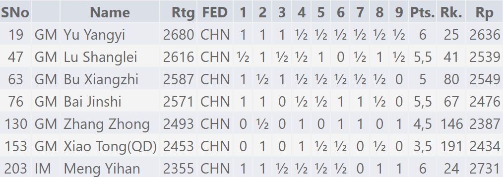 16岁的新秀孟奕涵继续惊艳表现,在第6~9轮取得2胜1和1负。他先是弈和了前欧洲冠军俄罗斯棋手莫特廖夫,随后负于俄罗斯名将涅波姆尼亚奇,第八和第九轮,连胜荷兰特级大师沃默丹和今年的世青赛冠军印度棋手普拉纳夫·V。前九轮过后,孟奕涵的表现分高达2731分!
