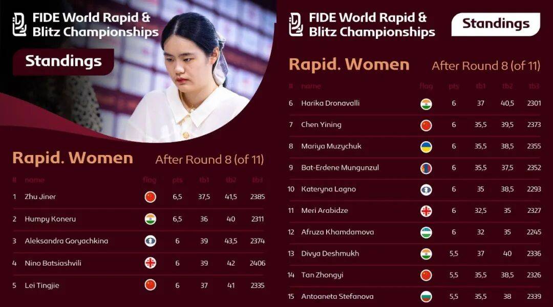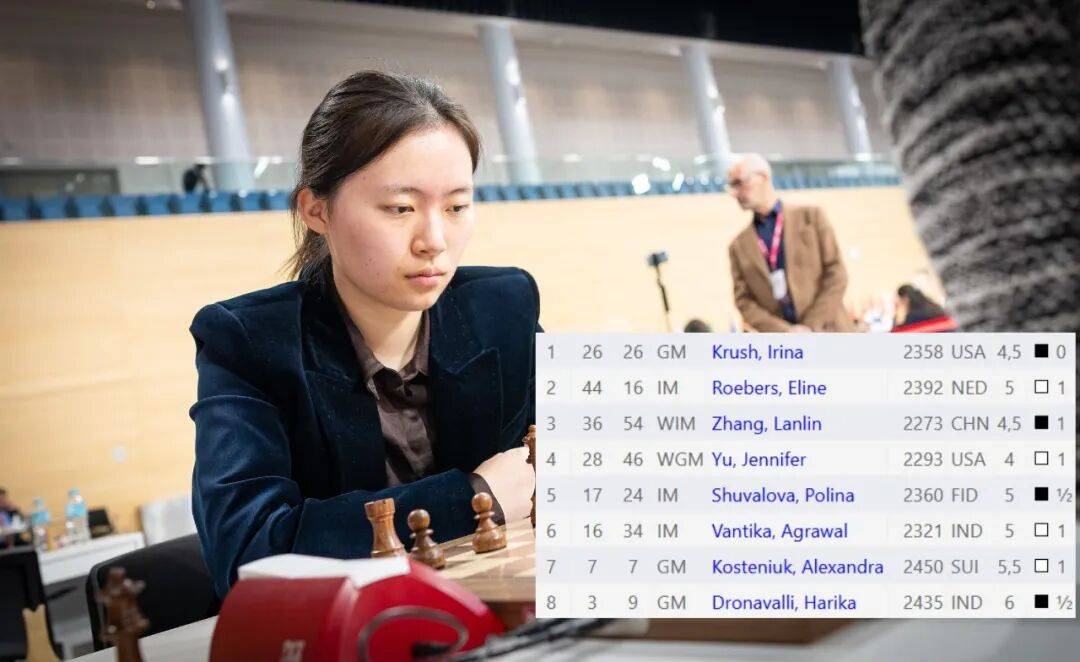 前世界棋后谭中怡目前4胜3和1负积5.5分,同分的还有另外两位前世界棋后科斯坚纽克和斯坦芳诺娃,以及印度棋手德什穆克、格鲁吉亚的扎格尼泽,乌克兰的大穆兹丘克等。